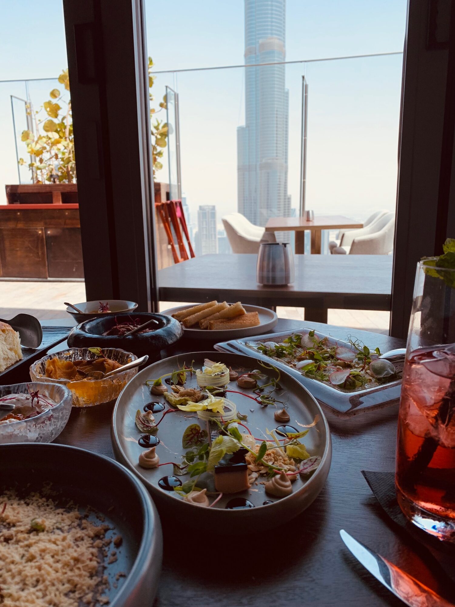 Wenn Sie auf „Mittagessen mit Aussicht“ stehen, ist es anmaßend Dies ist das Restaurant eine wirklich gute Wahl, denn hier sitzt man im 54. Stock mit direktem Blick auf den Burj Khalifa Tower, und es gibt eine Außenterrasse, die sich perfekt für Fotos eignet.